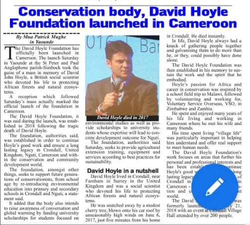 Marceline has been planning a trip to Nguti to assess the situation and discuss the project with the school, the authorities, local builders, etc. She was able to undertake this trip in early April. This also allowed her family to hold a Mass Service to celebrate David's life. This was followed by a reception to mark the launch of the foundation in Cameroon itself. VIPs and guests were invited to the event, which was well attended. The event received coverage in the newspapers. This is shown below.